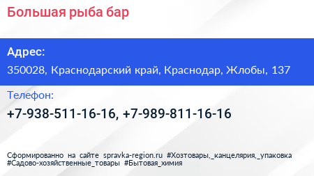 Большая рыба, бар по адресу 350028, Краснодарский край, Краснодар, Жлобы, 137 в дальнейшем Организация, размещена в следующих категориях: