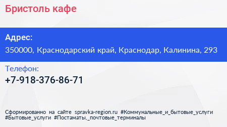 Бристоль, кафе по адресу 350000, Краснодарский край, Краснодар, Калинина, 293 в дальнейшем Организация, размещена в следующих категориях: