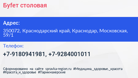 Буfeт, столовая по адресу 350072, Краснодарский край, Краснодар, Московская, 59/1 в дальнейшем Организация, размещена в следующих категориях: