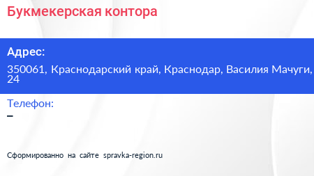 Букмекерская контора по адресу 350061, Краснодарский край, Краснодар, Василия Мачуги, 24 в дальнейшем Организация, размещена в следующих категориях: