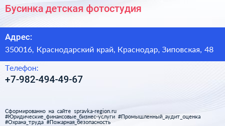 Бусинка, детская фотостудия по адресу 350016, Краснодарский край, Краснодар, Зиповская, 48 в дальнейшем Организация, размещена в следующих категориях: