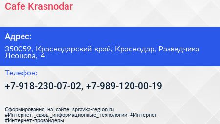Cafe Krasnodar по адресу 350059, Краснодарский край, Краснодар, Разведчика Леонова, 4 в дальнейшем Организация, размещена в следующих категориях: