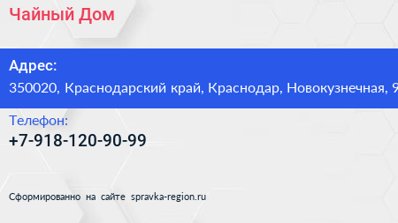 Чайный Дом по адресу 350020, Краснодарский край, Краснодар, Новокузнечная, 9 в дальнейшем Организация, размещена в следующих категориях: