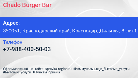 Chado Burger Bar по адресу 350051, Краснодарский край, Краснодар, Дальняя, 8 лит1 в дальнейшем Организация, размещена в следующих категориях: