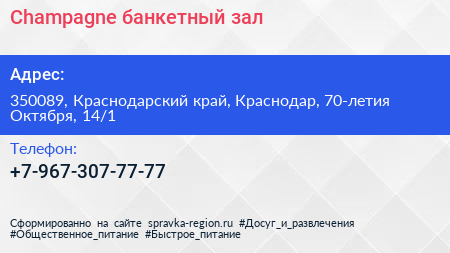 Champagne, банкетный зал по адресу 350089, Краснодарский край, Краснодар, 70-летия Октября, 14/1 в дальнейшем Организация, размещена в следующих категориях: