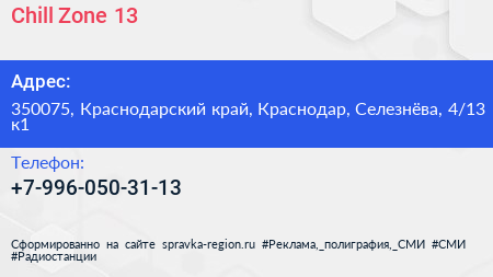 Chill Zone 13 по адресу 350075, Краснодарский край, Краснодар, Селезнёва, 4/13 к1 в дальнейшем Организация, размещена в следующих категориях: