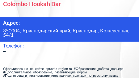 Colombo Hookah Bar по адресу 350004, Краснодарский край, Краснодар, Кожевенная, 54/1 в дальнейшем Организация, размещена в следующих категориях: