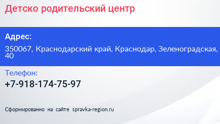 Детско-родительский центр по адресу 350067, Краснодарский край, Краснодар, Зеленоградская, 40 в дальнейшем Организация, размещена в следующих категориях: