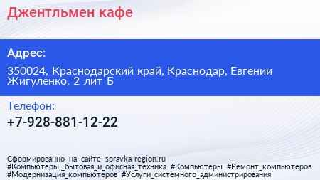Джентльмен, кафе по адресу 350024, Краснодарский край, Краснодар, Евгении Жигуленко, 2 лит Б в дальнейшем Организация, размещена в следующих категориях: