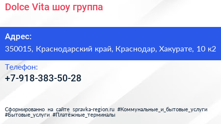 Dolce Vita, шоу-группа по адресу 350015, Краснодарский край, Краснодар, Хакурате, 10 к2 в дальнейшем Организация, размещена в следующих категориях: