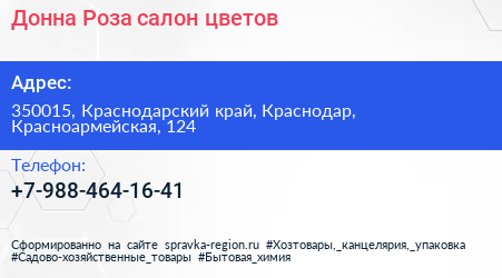 Донна Роза, салон цветов по адресу 350015, Краснодарский край, Краснодар, Красноармейская, 124 в дальнейшем Организация, размещена в следующих категориях: