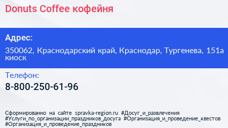 Donuts & Coffee, кофейня по адресу 350062, Краснодарский край, Краснодар, Тургенева, 151а киоск в дальнейшем Организация, размещена в следующих категориях: