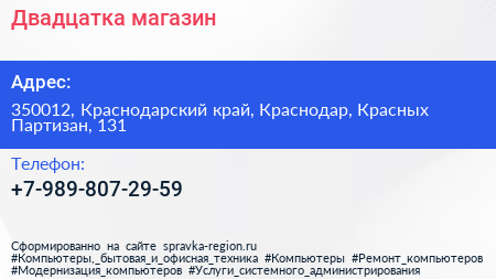 Двадцатка, магазин по адресу 350012, Краснодарский край, Краснодар, Красных Партизан, 131 в дальнейшем Организация, размещена в следующих категориях: