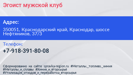 Эгоист, мужской клуб по адресу 350051, Краснодарский край, Краснодар, шоссе Нефтяников, 37/3 в дальнейшем Организация, размещена в следующих категориях:
