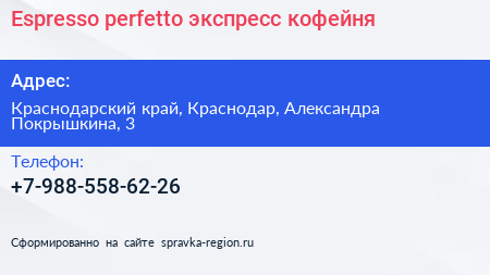 Espresso perfetto, экспресс-кофейня по адресу Краснодарский край, Краснодар, Александра Покрышкина, 3 в дальнейшем Организация, размещена в следующих категориях: