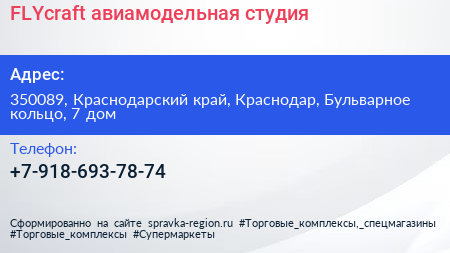 FLYcraft, авиамодельная студия по адресу 350089, Краснодарский край, Краснодар, Бульварное кольцо, 7 дом в дальнейшем Организация, размещена в следующих категориях:
