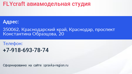 FLYcraft, авиамодельная студия по адресу 350062, Краснодарский край, Краснодар, проспект Константина Образцова, 20 в дальнейшем Организация, размещена в следующих категориях: