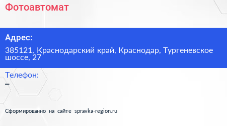 Фотоавтомат по адресу 385121, Краснодарский край, Краснодар, Тургеневское шоссе, 27 в дальнейшем Организация, размещена в следующих категориях: