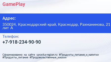 GamePlay по адресу 350024, Краснодарский край, Краснодар, Рахманинова, 21 лит А в дальнейшем Организация, размещена в следующих категориях: