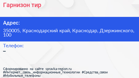 Гарнизон, тир по адресу 350005, Краснодарский край, Краснодар, Дзержинского, 100 в дальнейшем Организация, размещена в следующих категориях: