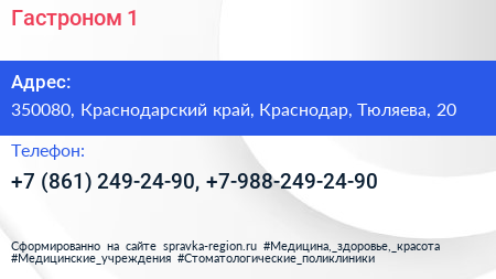 Гастроном №1 по адресу 350080, Краснодарский край, Краснодар, Тюляева, 20 в дальнейшем Организация, размещена в следующих категориях: