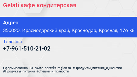 Gelati, кафе-кондитерская по адресу 350020, Краснодарский край, Краснодар, Красная, 176 к8 в дальнейшем Организация, размещена в следующих категориях: