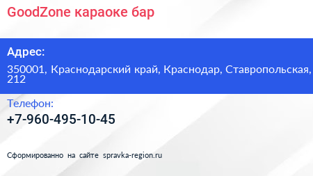 GoodZone, караоке-бар по адресу 350001, Краснодарский край, Краснодар, Ставропольская, 212 в дальнейшем Организация, размещена в следующих категориях: