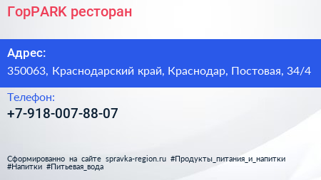 ГорPARK, ресторан по адресу 350063, Краснодарский край, Краснодар, Постовая, 34/4 в дальнейшем Организация, размещена в следующих категориях: