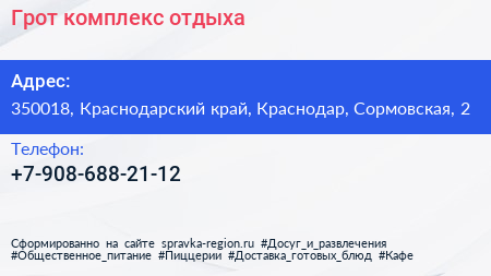 Грот, комплекс отдыха по адресу 350018, Краснодарский край, Краснодар, Сормовская, 2 в дальнейшем Организация, размещена в следующих категориях: