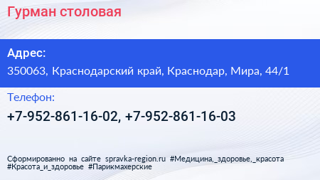 Гурман, столовая по адресу 350063, Краснодарский край, Краснодар, Мира, 44/1 в дальнейшем Организация, размещена в следующих категориях: