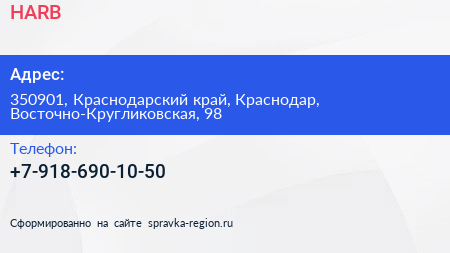 HARB по адресу 350901, Краснодарский край, Краснодар, Восточно-Кругликовская, 98 в дальнейшем Организация, размещена в следующих категориях: