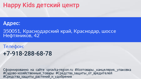 Happy Kids, детский центр по адресу 350051, Краснодарский край, Краснодар, шоссе Нефтяников, 42 в дальнейшем Организация, размещена в следующих категориях: