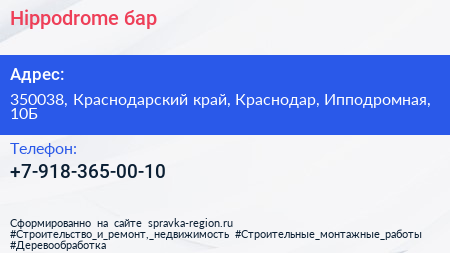 Hippodrome, бар по адресу 350038, Краснодарский край, Краснодар, Ипподромная, 10Б в дальнейшем Организация, размещена в следующих категориях: