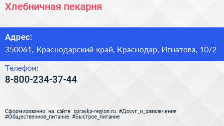 Хлебничная, пекарня по адресу 350061, Краснодарский край, Краснодар, Игнатова, 10/2 в дальнейшем Организация, размещена в следующих категориях: