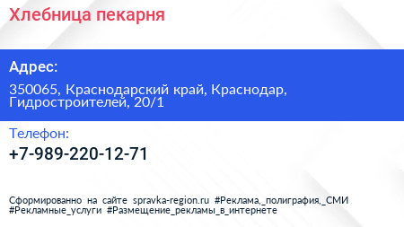 Хлебница, пекарня по адресу 350065, Краснодарский край, Краснодар, Гидростроителей, 20/1 в дальнейшем Организация, размещена в следующих категориях: