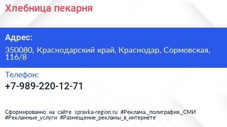 Хлебница, пекарня по адресу 350080, Краснодарский край, Краснодар, Сормовская, 116/8 в дальнейшем Организация, размещена в следующих категориях: