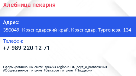 Хлебница, пекарня по адресу 350049, Краснодарский край, Краснодар, Тургенева, 134 в дальнейшем Организация, размещена в следующих категориях: