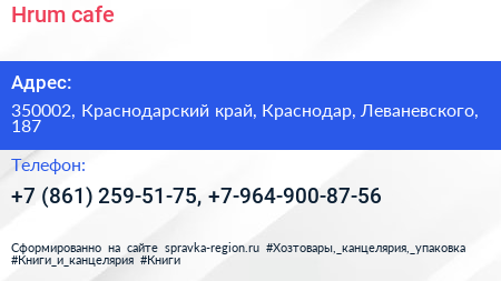 Hrum cafe по адресу 350002, Краснодарский край, Краснодар, Леваневского, 187 в дальнейшем Организация, размещена в следующих категориях:
