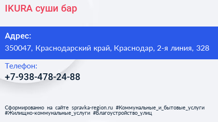 IKURA, суши-бар по адресу 350047, Краснодарский край, Краснодар, 2-я линия, 328 в дальнейшем Организация, размещена в следующих категориях: