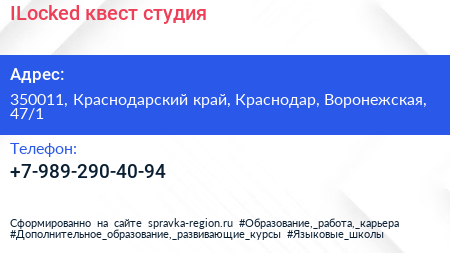 ILocked, квест-студия по адресу 350011, Краснодарский край, Краснодар, Воронежская, 47/1 в дальнейшем Организация, размещена в следующих категориях: