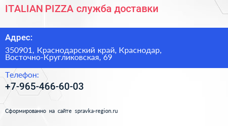 ITALIAN PIZZA, служба доставки по адресу 350901, Краснодарский край, Краснодар, Восточно-Кругликовская, 69 в дальнейшем Организация, размещена в следующих категориях: