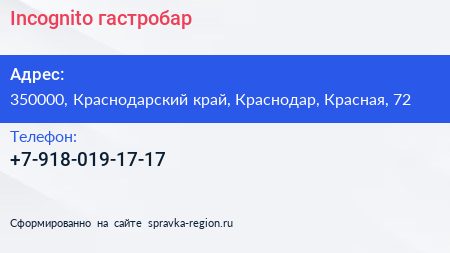 Incognito, гастробар по адресу 350000, Краснодарский край, Краснодар, Красная, 72 в дальнейшем Организация, размещена в следующих категориях: