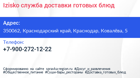 Izisko, служба доставки готовых блюд по адресу 350062, Краснодарский край, Краснодар, Ковалёва, 5 в дальнейшем Организация, размещена в следующих категориях: