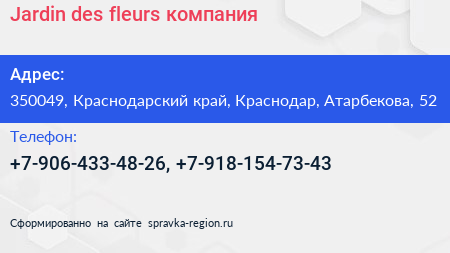 Jardin des fleurs, компания по адресу 350049, Краснодарский край, Краснодар, Атарбекова, 52 в дальнейшем Организация, размещена в следующих категориях: