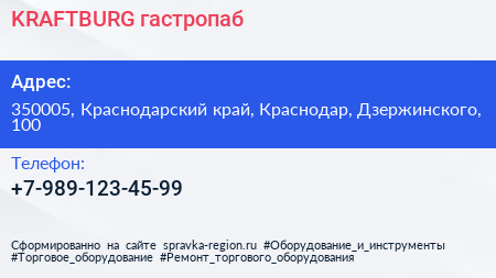 KRAFTBURG, гастропаб по адресу 350005, Краснодарский край, Краснодар, Дзержинского, 100 в дальнейшем Организация, размещена в следующих категориях: