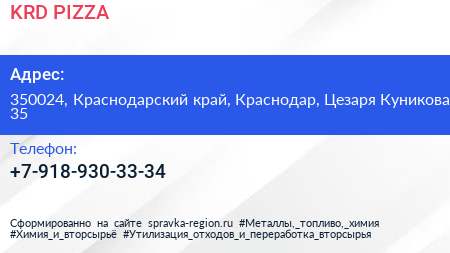KRD PIZZA по адресу 350024, Краснодарский край, Краснодар, Цезаря Куникова, 35 в дальнейшем Организация, размещена в следующих категориях: