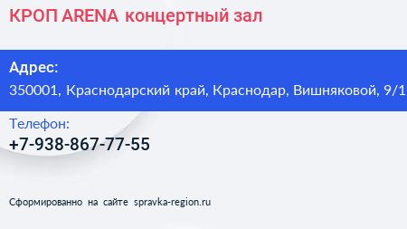 КРОП-ARENA, концертный зал по адресу 350001, Краснодарский край, Краснодар, Вишняковой, 9/1 в дальнейшем Организация, размещена в следующих категориях: