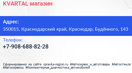 KVARTAL, магазин по адресу 350015, Краснодарский край, Краснодар, Будённого, 143 в дальнейшем Организация, размещена в следующих категориях:
