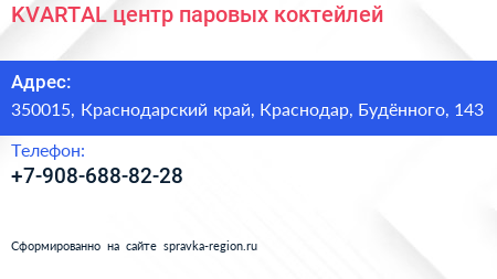KVARTAL, центр паровых коктейлей по адресу 350015, Краснодарский край, Краснодар, Будённого, 143 в дальнейшем Организация, размещена в следующих категориях: