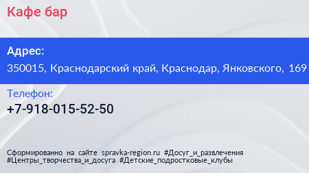 Кафе-бар по адресу 350015, Краснодарский край, Краснодар, Янковского, 169 в дальнейшем Организация, размещена в следующих категориях: